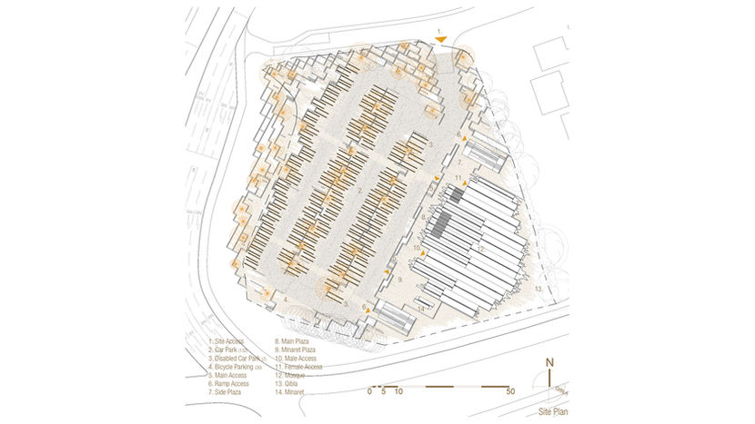 We have embraced the requirement to orientate the mosque towards Mecca by extending this axis across the site into a design grid where all elements, architectural, structural and landscape are aligned in a holistic manner. This 4.8m grid provides a suitable framework for laying out the car parking and the pillars supporting the mosque’s vaults.